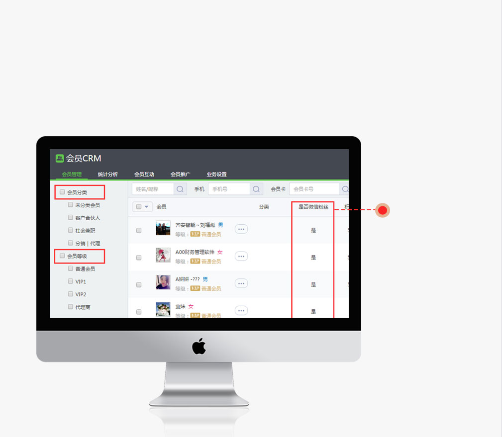 線上線下會(huì)員一體管理,服務(wù)號(hào)粉絲一鍵導(dǎo)入會(huì)員CRM,關(guān)注即會(huì)員,多維會(huì)員檔案庫(kù),會(huì)員積分,會(huì)員儲(chǔ)值,會(huì)員跟進(jìn)、會(huì)員消費(fèi)記