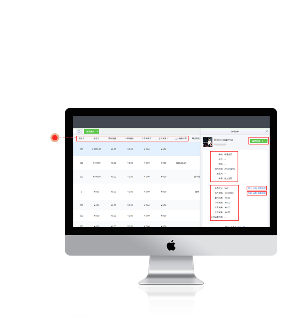 方便查詢會(huì)員基礎(chǔ)信息、積分抵扣、賬戶余額、跟進(jìn)記錄等信息。